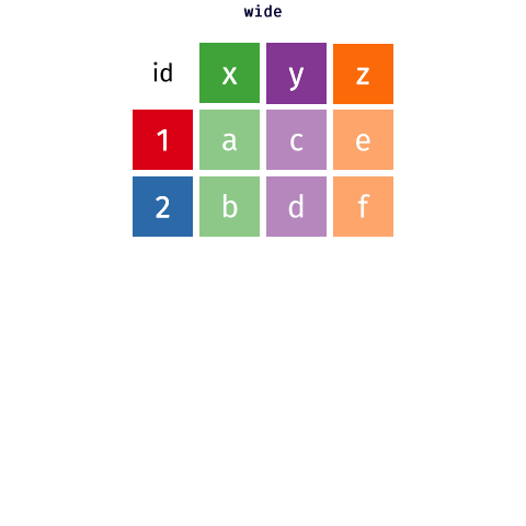 class: title-slide, center, middle .top-left[ <img src="images/uo-logo2.png" width="100%" /> ] .top-right[ <img src="images/psy-logo.png" width="100%" /> ] # Data Reshaping with {tidyr} UO R Bootcamp 2025 --- # What is "tidy" data? There are three interrelated rules which make a dataset tidy: -- 1. Each variable must have its own column. 1. Each observation must have its own row. 1. Each value must have its own cell. -- <img src="images/tidy_data.png" width="2560" /> .footnote[Source: [R for Data Science](https://r4ds.had.co.nz/tidy-data.html#tidy-data-1)] --- # What is "tidy" data? <img src="images/tidy_data_2.png" width="2560" /> .footnote[Source: [R for Data Science](https://r4ds.had.co.nz/tidy-data.html#tidy-data-1)] --- # What is "tidy" data? <img src="images/tidy_data_3.png" width="2560" /> .footnote[Source: [R for Data Science](https://r4ds.had.co.nz/tidy-data.html#tidy-data-1)] --- # What is "tidy" data? <img src="images/tidy_data_4.png" width="1955" /> .footnote[Source: [R for Data Science](https://r4ds.had.co.nz/tidy-data.html#tidy-data-1)] --- # What is "tidy" data? <img src="images/tidy_data_5.png" width="2311" /> .footnote[Source: [R for Data Science](https://r4ds.had.co.nz/tidy-data.html#tidy-data-1)] --- class: inverse, center, middle # Pivoting --- background-image: url(images/hex/tidyr.png) background-position: 90% 5% background-size: 10% # Pivoting Most of the data you encounter in the real world will, unfortunately, not be in tidy format. -- This means you will need to reshape your data into a format that is tidy. --- background-image: url(images/hex/tidyr.png) background-position: 90% 5% background-size: 10% # Pivoting This is where the `{tidyr}` package comes in. It contains two crucial functions that you can use to reshape your data: -- .pull-left[ `pivot_longer()` "lengthens" data, increasing the number of rows and decreasing the number of columns. ] .pull-right[ `pivot_wider()` "widens" data, increasing the number of columns and decreasing the number of rows. ] *** ***Note:*** The old versions of these functions were called `gather()` and `spread()`. --- background-image: url(images/hex/tidyr.png) background-position: 90% 5% background-size: 10% # Pivoting <!-- --> .footnote[Source: [Mara Averick](https://twitter.com/dataandme/status/1175913657907253254?s=20) and [Garrick Aden-Buie](https://github.com/gadenbuie/tidyexplain)] --- # Example data Our example data is the total student enrollment for the University of Oregon, Oregon State University, and Portland State University between 2020 and 2021. -- *** .pull-left[ We need to reshape this data to a longer format ``` r enrollment ``` ``` ## # A tibble: 3 × 3 ## university `2020` `2021` ## <chr> <dbl> <dbl> ## 1 UO 21800 22298 ## 2 OSU 33359 34108 ## 3 PSU 26012 23181 ``` ] -- .pull-right[ + The column names `2020` and `2021` are not variables in our data, instead they represent values of the year variable + The values in the `2020` and `2021` columns represent values of the `enrollment` variable + Each row represents two observations, not one ] --- background-image: url(images/hex/tidyr.png) background-position: 90% 5% background-size: 10% # `pivot_longer()` ``` r enrollment ``` ``` ## # A tibble: 3 × 3 ## university `2020` `2021` ## <chr> <dbl> <dbl> ## 1 UO 21800 22298 ## 2 OSU 33359 34108 ## 3 PSU 26012 23181 ``` -- .smaller-font[We need 3 pieces of information to reshape (pivot) this data into a tidy format + The set of columns in `enrollment` whose names are actually values, not variables. In this example, those are the columns `2020` and `2021`. + The name of the variable to move the column names to. Here it is `year`. + The name of the variable to move the column values to. Here it’s `enrollment`. ] --- background-image: url(images/hex/tidyr.png) background-position: 90% 5% background-size: 10% # `pivot_longer()` .panelset[ .panel[.panel-name[Arguments] ``` r pivot_longer(data, cols, names_to, values_to) ``` `data` is a data frame to pivot. `cols` are the columns to pivot into longer format. `names_to` is a string specifying the name of the column to create from the data stored in the column names of `data`. `values_to` is a string specifying the name of the column to create from the data stored in the cell values. ] .panel[.panel-name[Example] ``` r enrollment %>% pivot_longer(cols = c(`2020`, `2021`), names_to = "year", values_to = "enrollment") ``` .pull-left[ **Output: A longer data frame** ``` ## # A tibble: 6 × 3 ## university year enrollment ## <chr> <chr> <dbl> ## 1 UO 2020 21800 ## 2 UO 2021 22298 ## 3 OSU 2020 33359 ## 4 OSU 2021 34108 ## 5 PSU 2020 26012 ## 6 PSU 2021 23181 ``` ] .pull-right[ .smaller-font[ **Notes** + We had to put the variable names `2020` and `2021` in backticks because column names are normally not allowed to start with numbers + `year` and `enrollment` do not exist in `enrollment` so we put their names in quotes.] ] ] ] --- class: split-60 background-image: url(images/hex/tidyr.png) background-position: 90% 5% background-size: 10% # `pivot_wider()` Below is a different data set (`enrollment2`) that needs to be reshaped to a wider format. A single observation is a `university` in a `year`, but each observation is spread across two rows. *** .column[ <br> .content[.center[ <br><br><br><br><br><br><br><br><br><br> ``` r enrollment2 ``` ``` ## # A tibble: 12 × 4 ## university year type count ## <chr> <dbl> <chr> <dbl> ## 1 UO 2020 enrollment 21800 ## 2 UO 2020 faculty 1926 ## 3 UO 2021 enrollment 22298 ## 4 UO 2021 faculty 1949 ## 5 OSU 2020 enrollment 33359 ## 6 OSU 2020 faculty 4730 ## 7 OSU 2021 enrollment 34108 ## 8 OSU 2021 faculty 4798 ## 9 PSU 2020 enrollment 26012 ## 10 PSU 2020 faculty 1694 ## 11 PSU 2021 enrollment 23181 ## 12 PSU 2021 faculty 1690 ``` ]]] -- .column[ <br><br> .content[ <br><br><br><br><br><br><br><br><br><br> To tidy this up, we need two pieces of information: + The column to take variable names from (`type`) + The column to take values from (`c